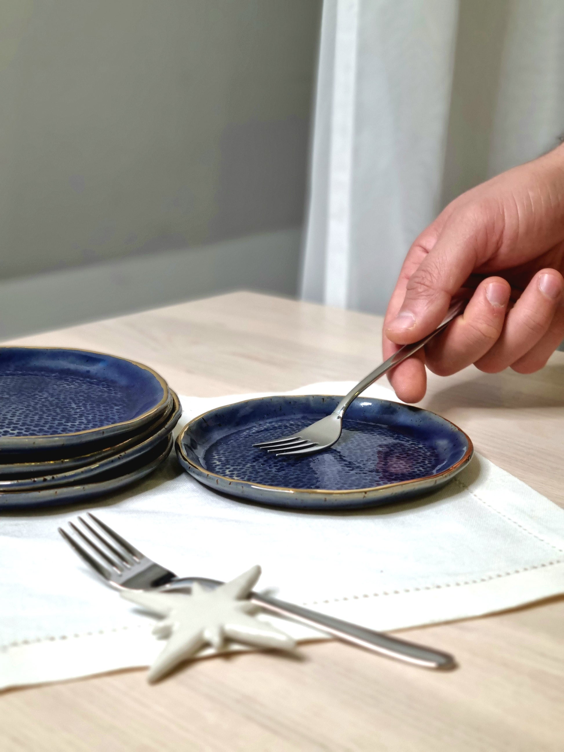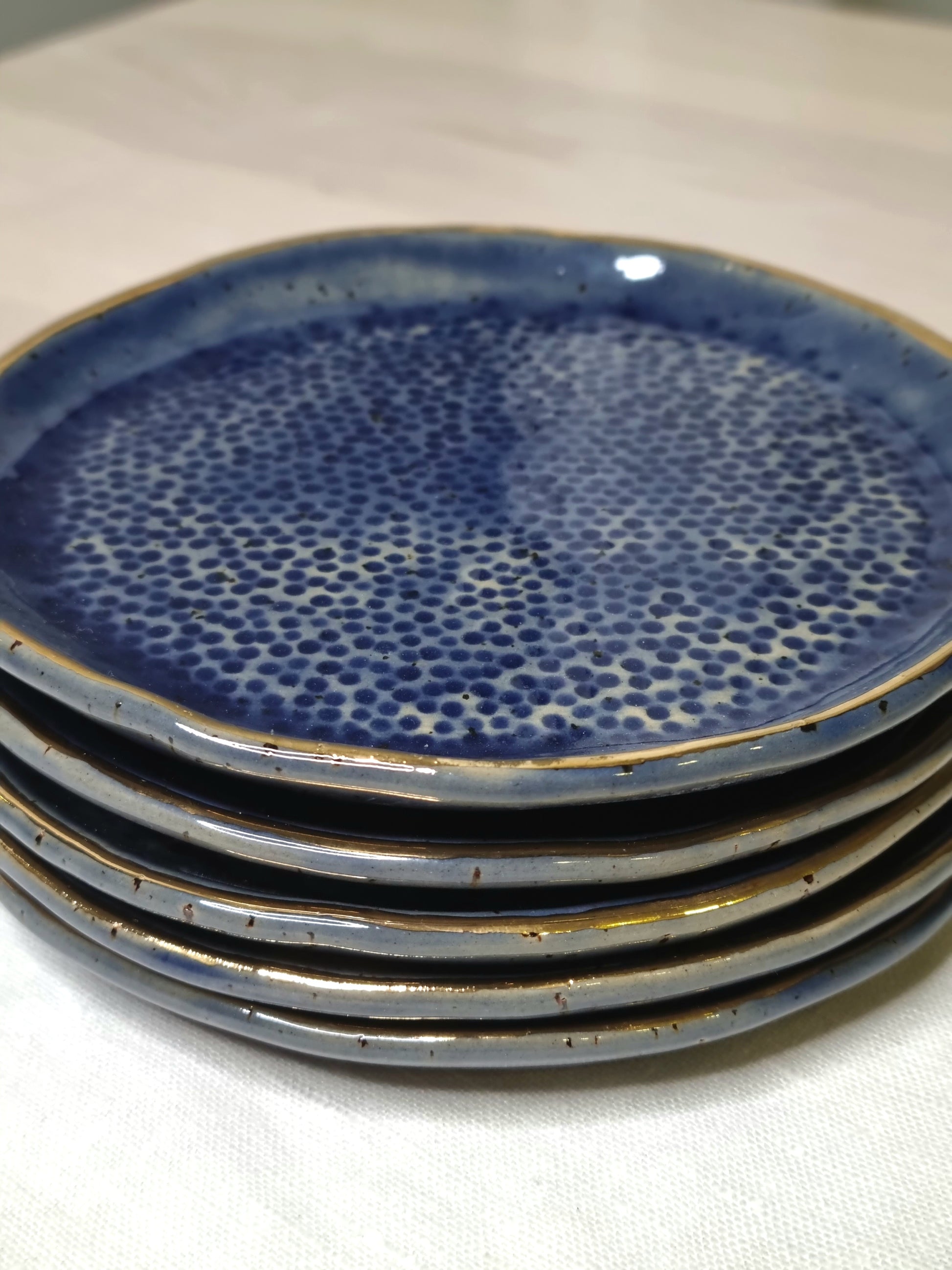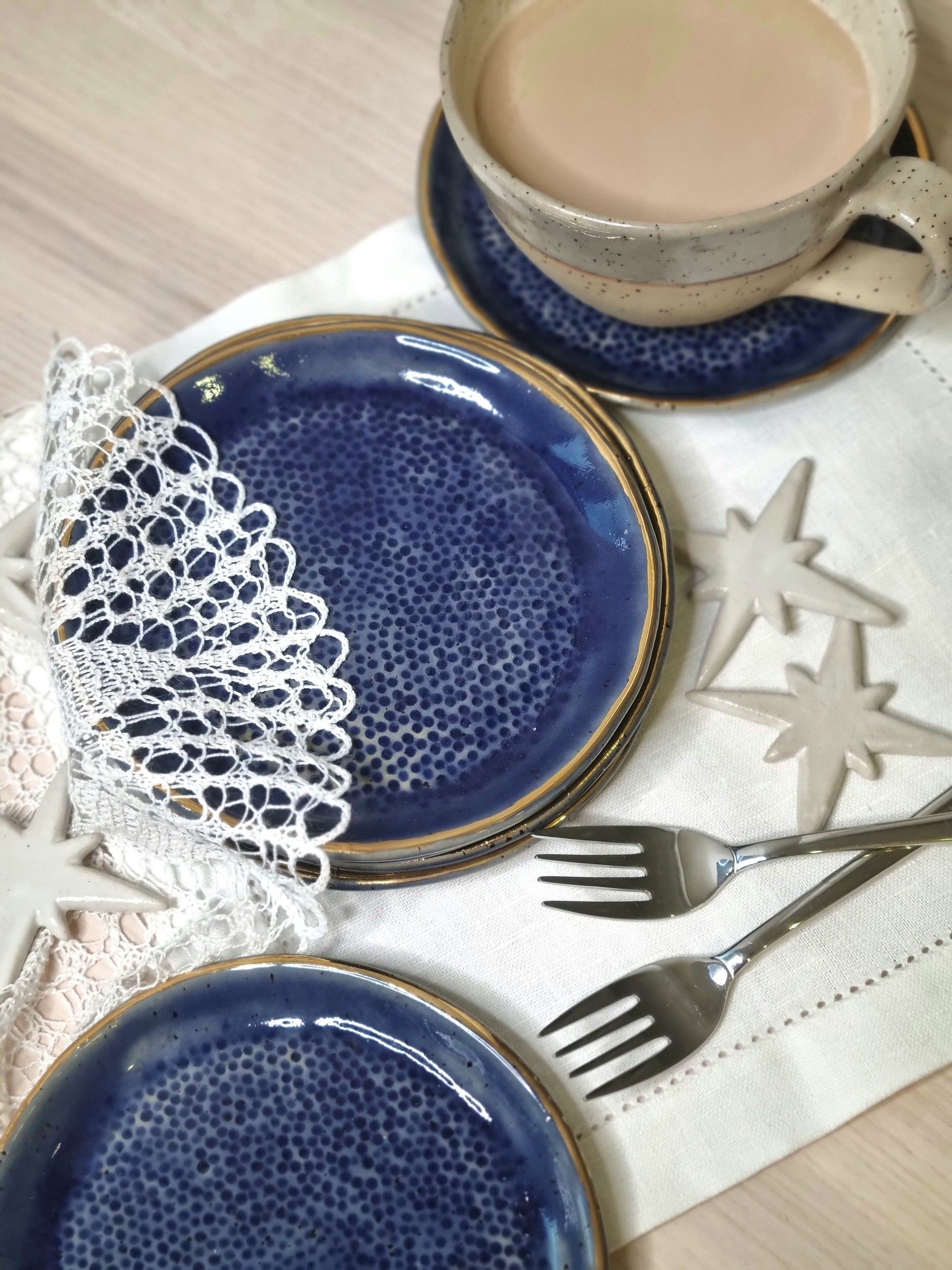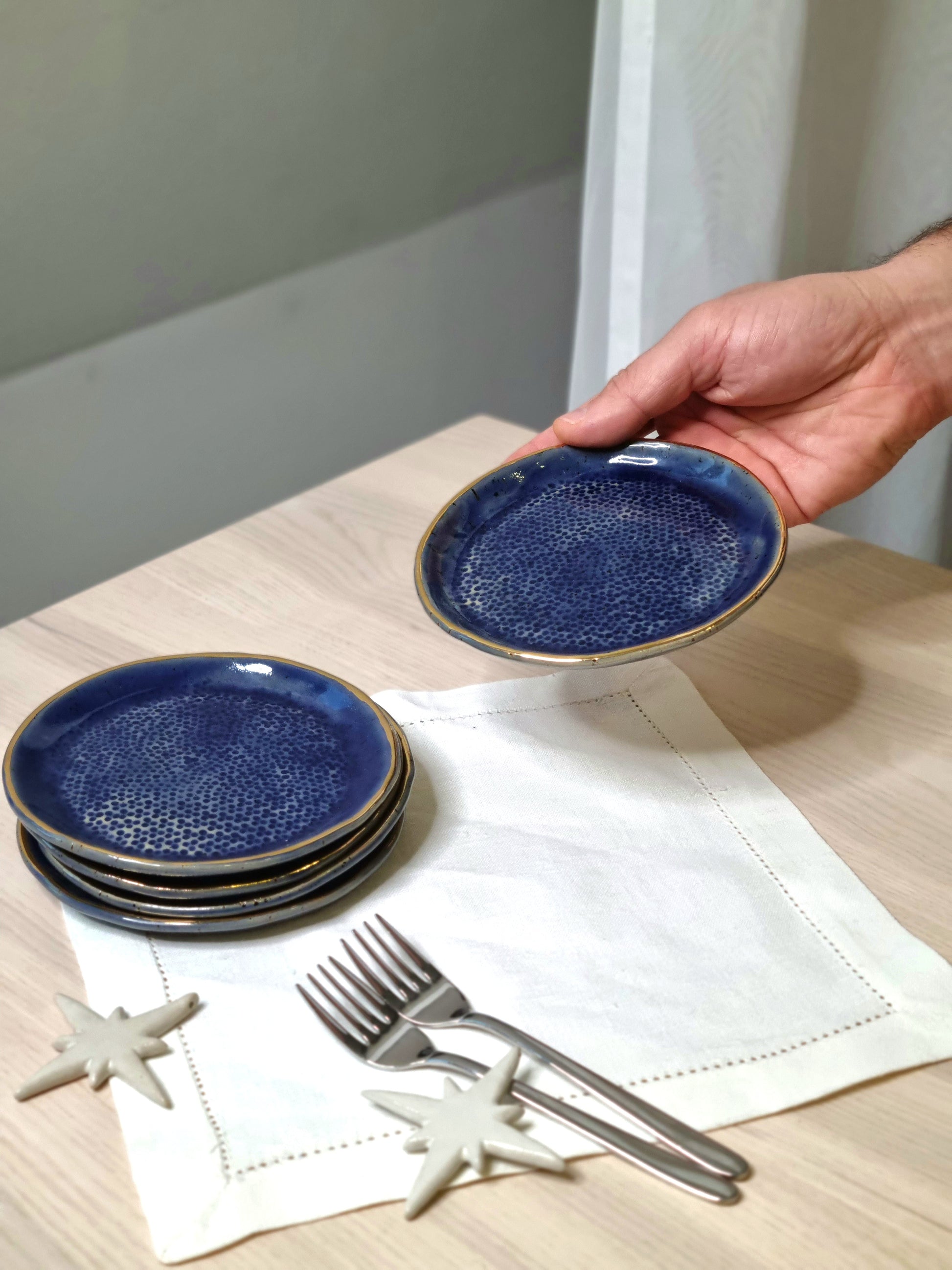 Tamsiai mėlynos spalvos desertinė lėkštutė pagaminta iš taškuoto molio ir dekoruota aukso krašteliu.