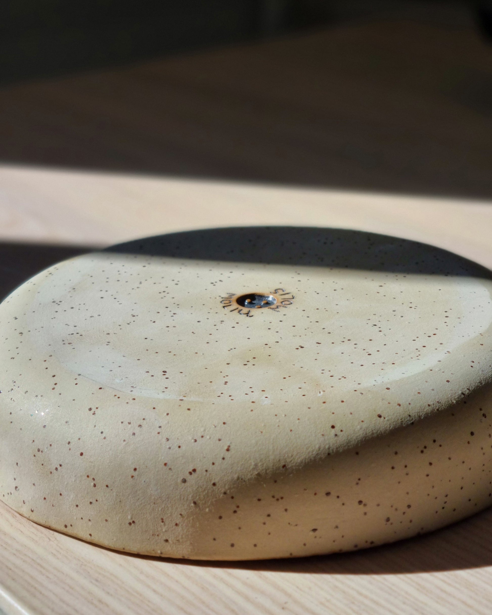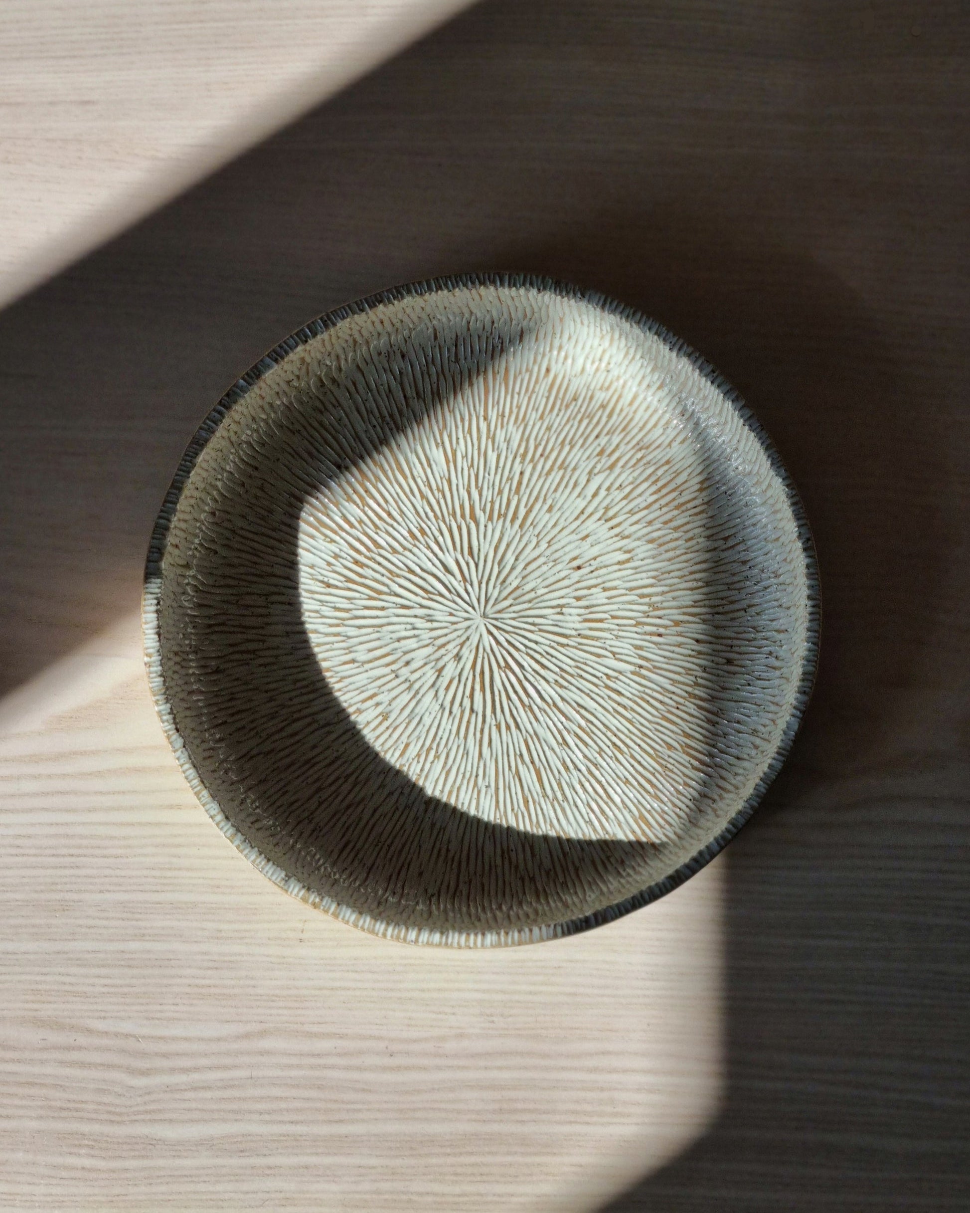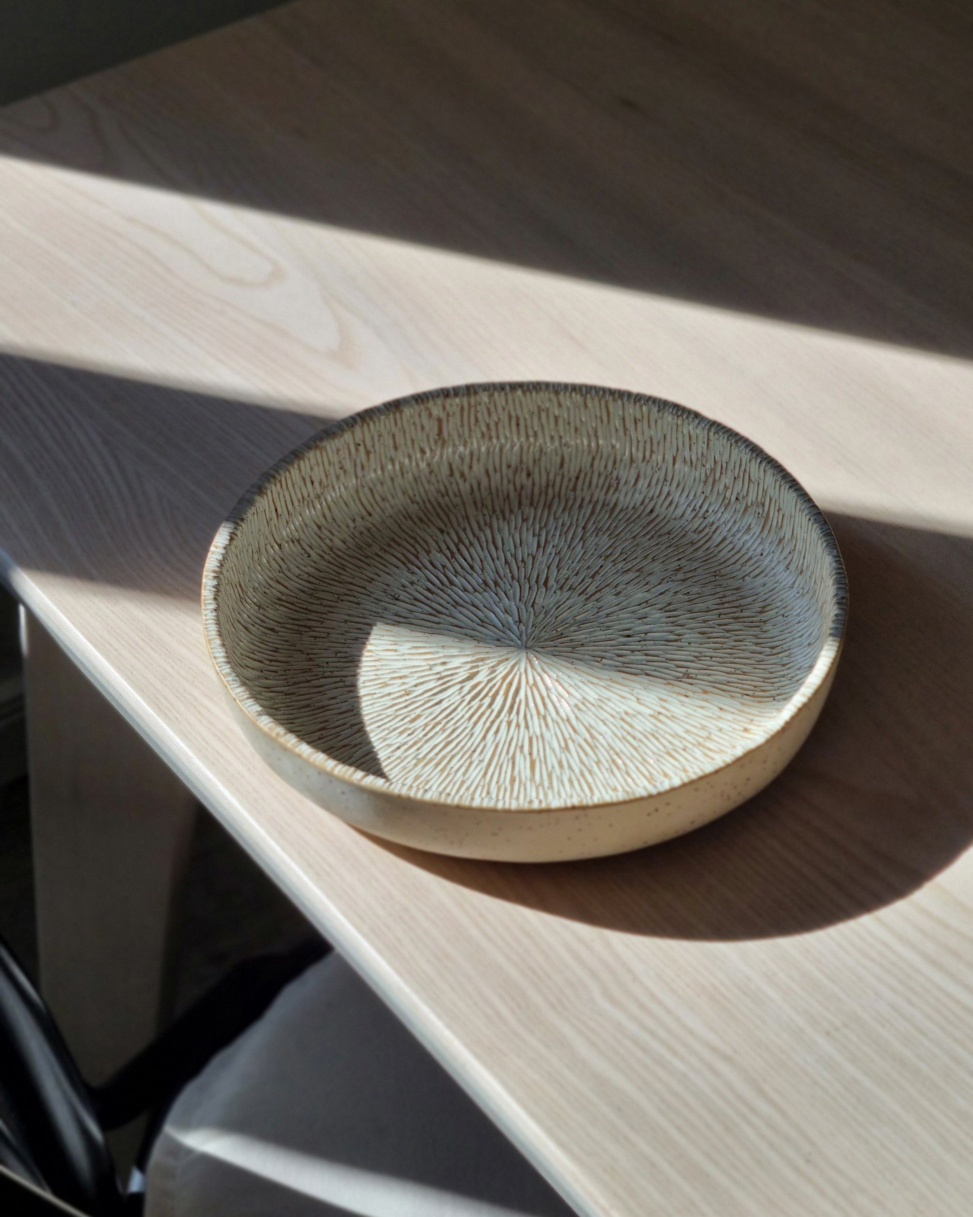 Taškuoto molio serviravimo lėkštė paaukštintais kraštais ir raižytu vidumi.