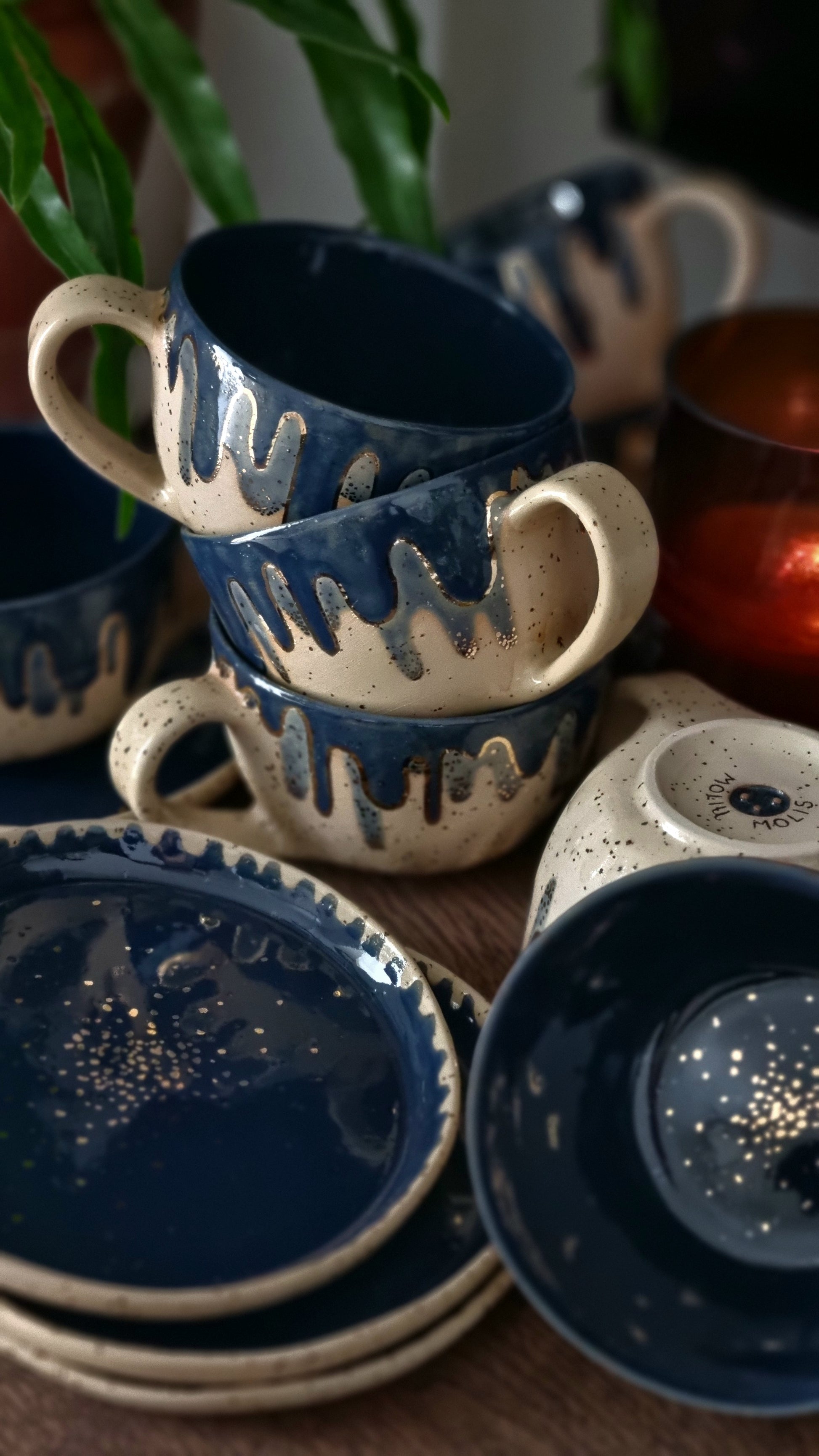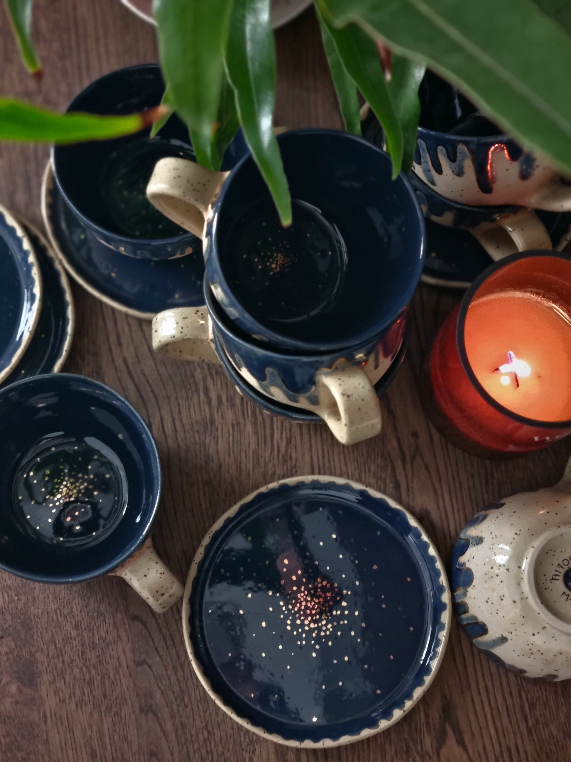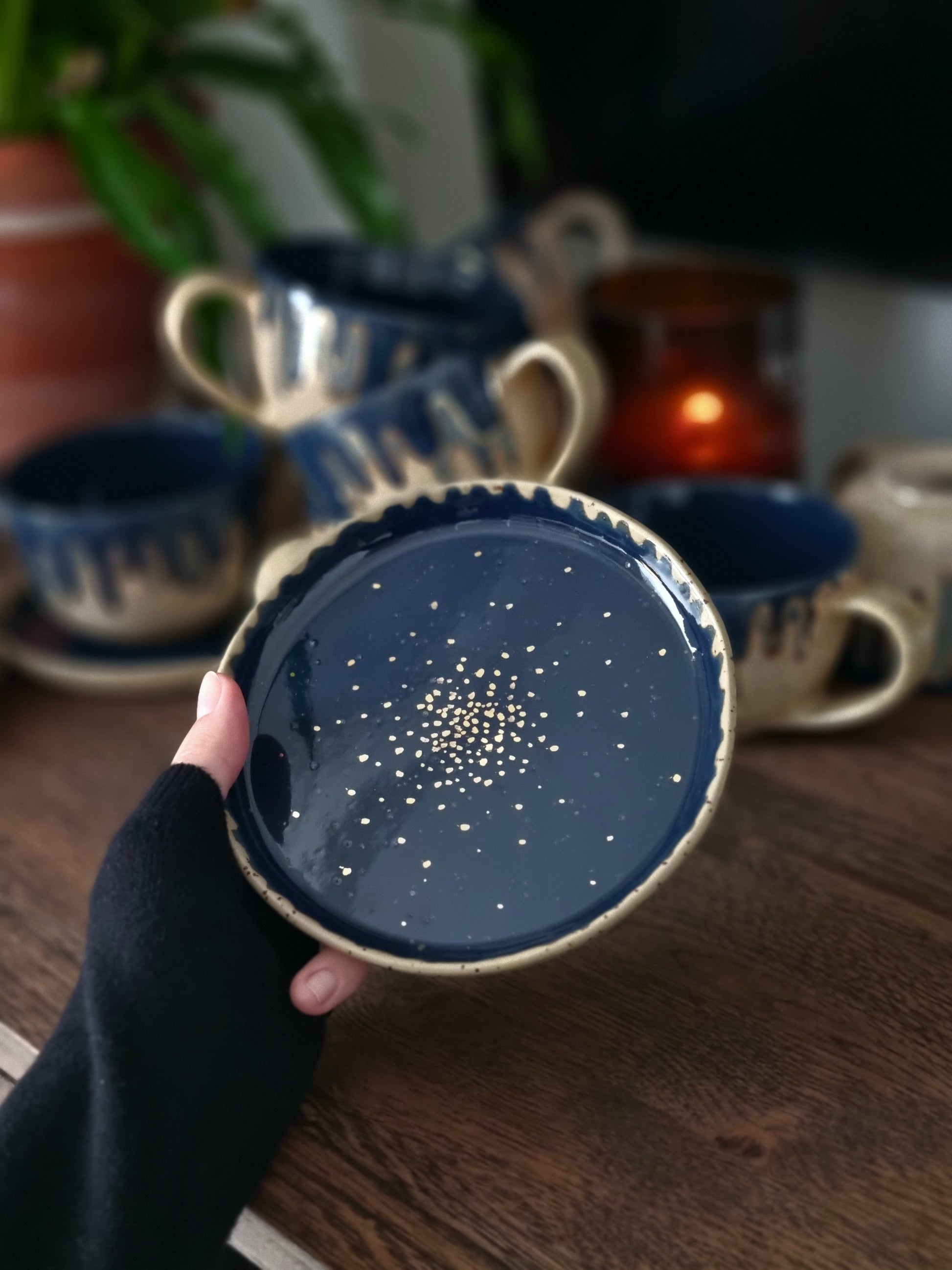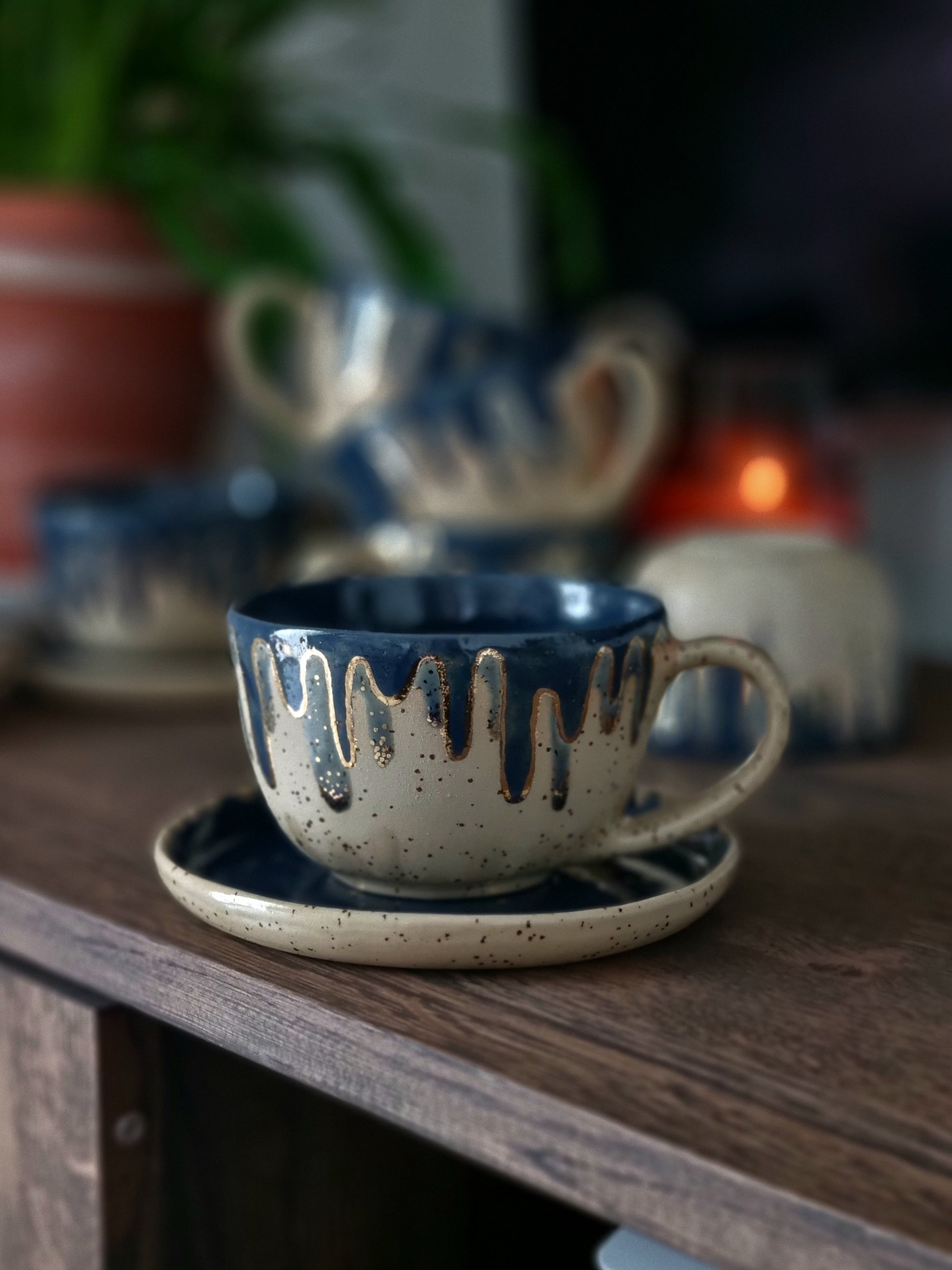 Tamsiai mėlyno taškuoto puodelio bei lėkštutės komplektas, dekoruotas tikro aukso detalėmis. Elegantiškos apvalios formos.