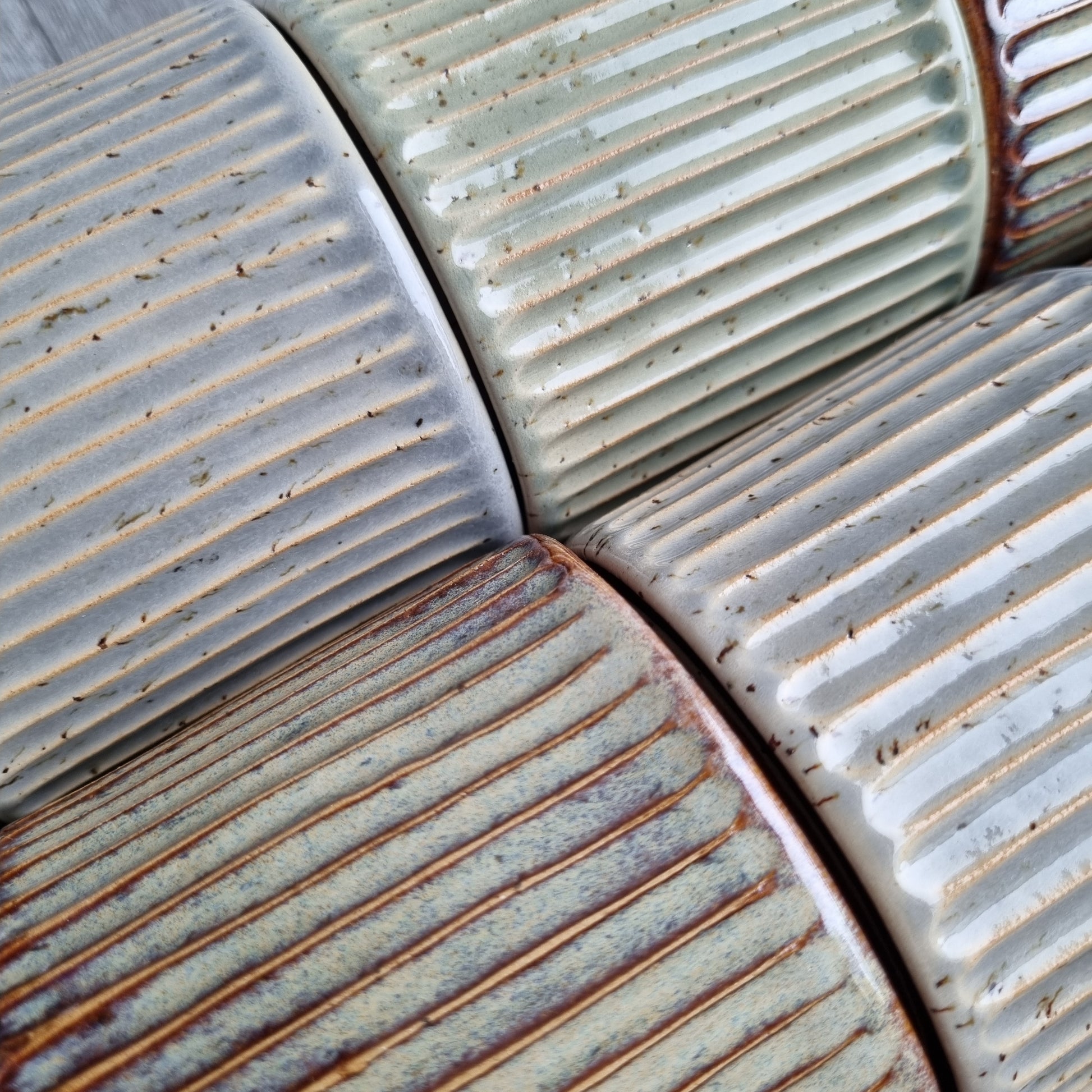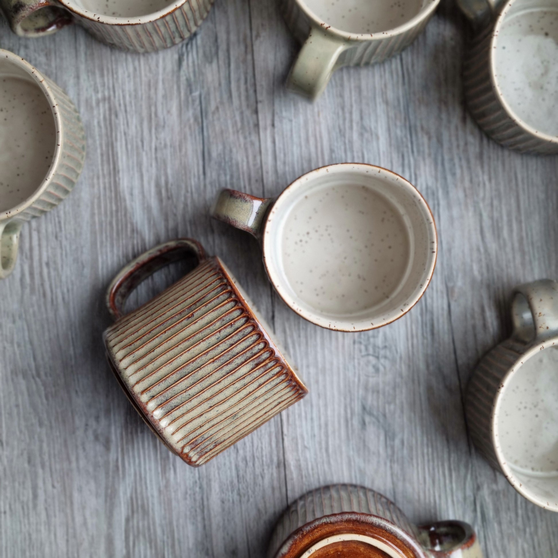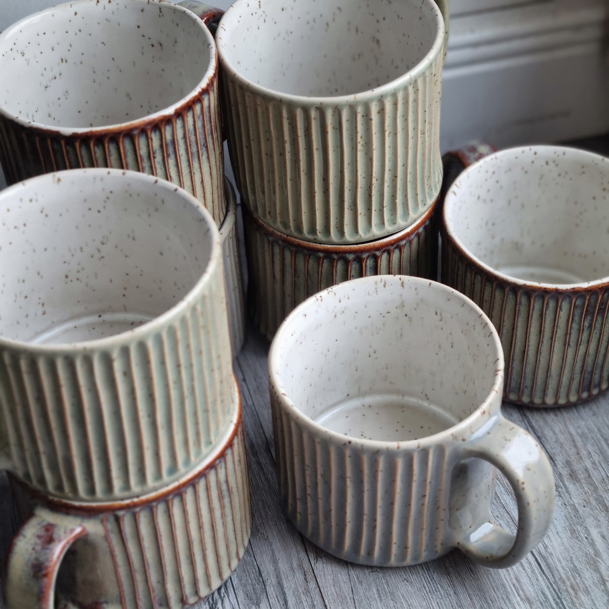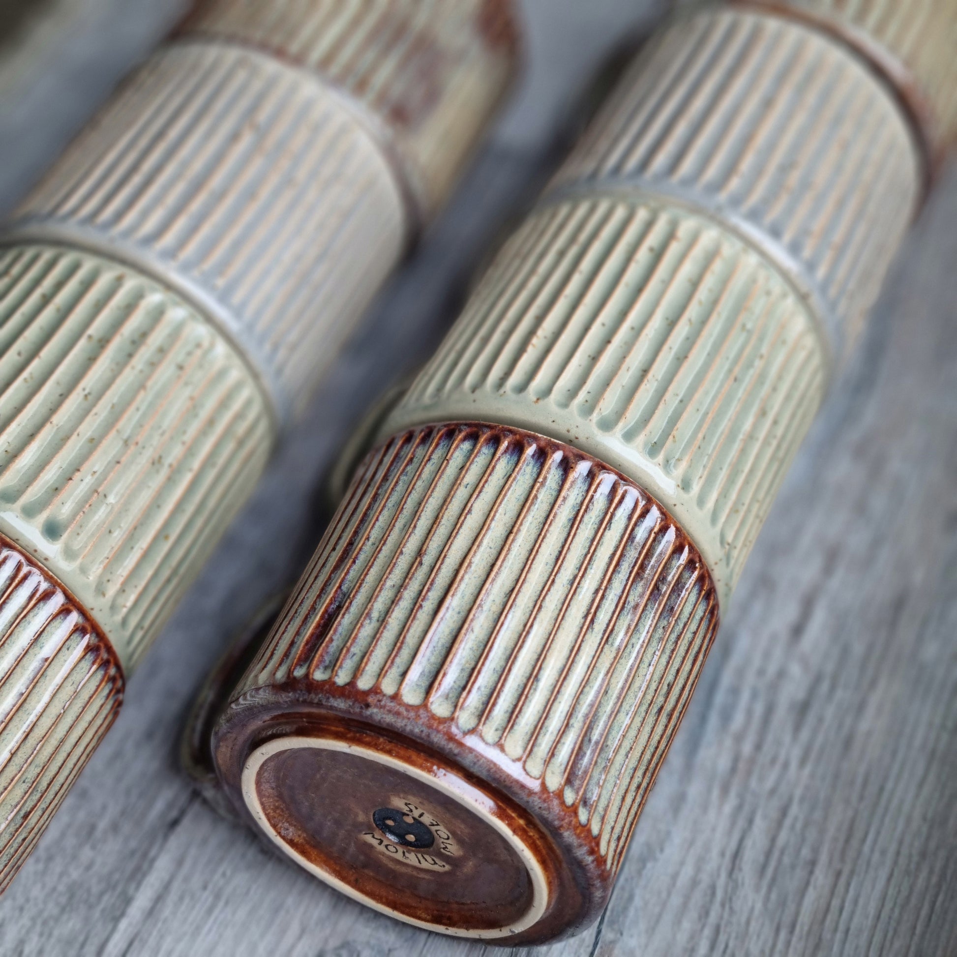 Puodelis iš rudo taškuoto molio, baltu vidumi. Padailintas vertikaliais raižiniais. Galimi trys tarpusavyje labai gražiai derančių spalvų pasirinkimai.