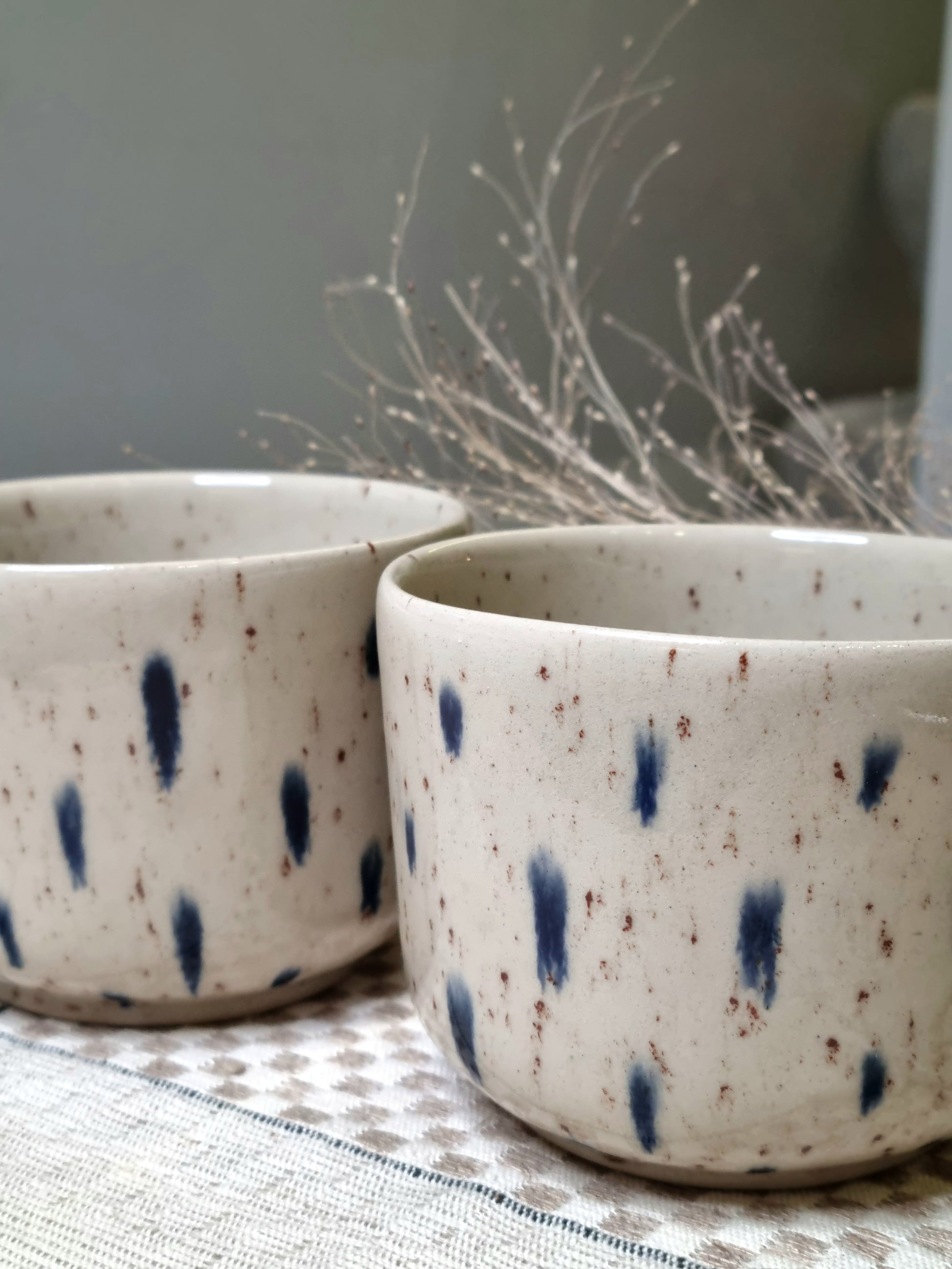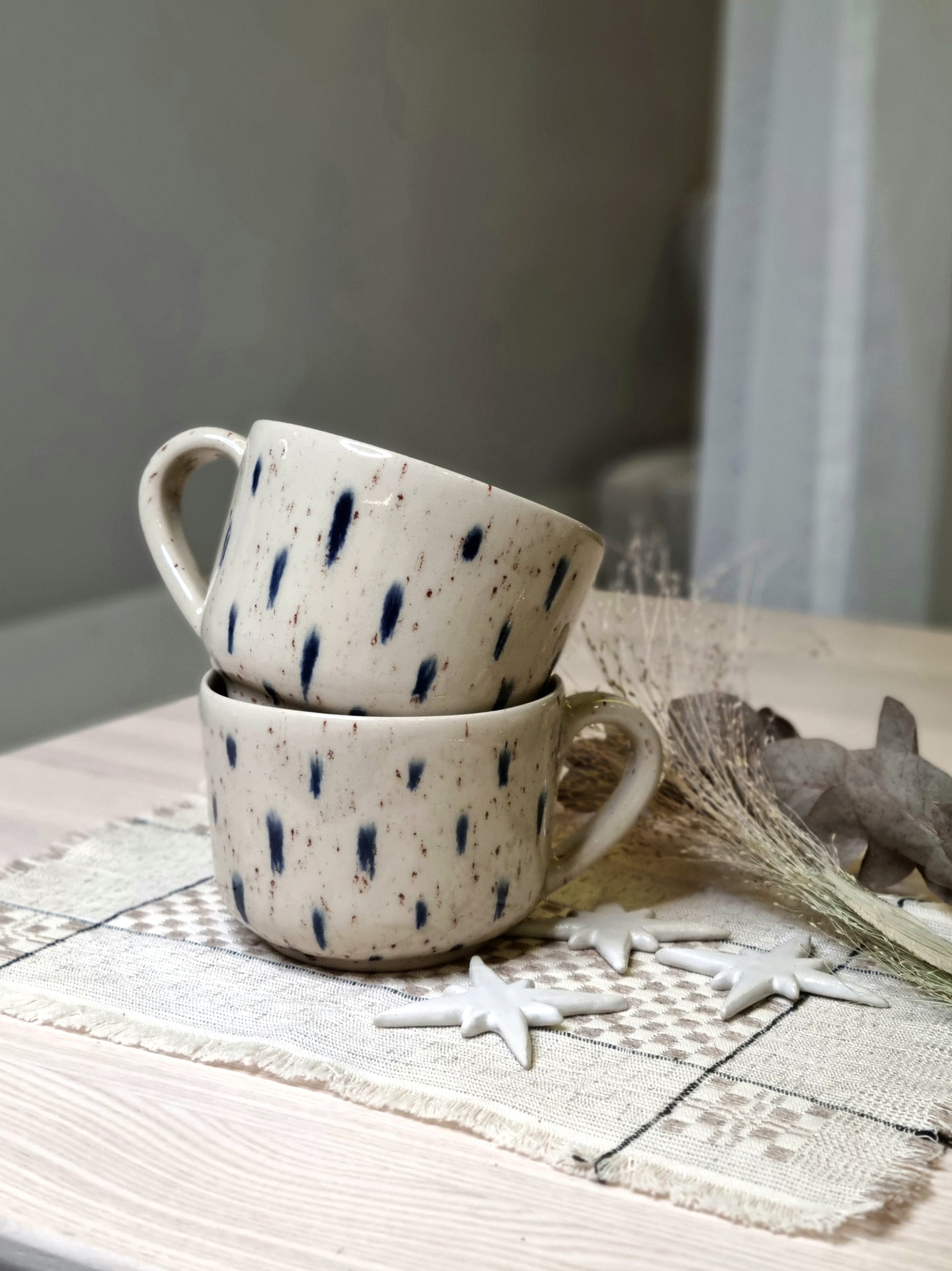 Taškuotas puodelis su mėlynomis dėmelėmis.