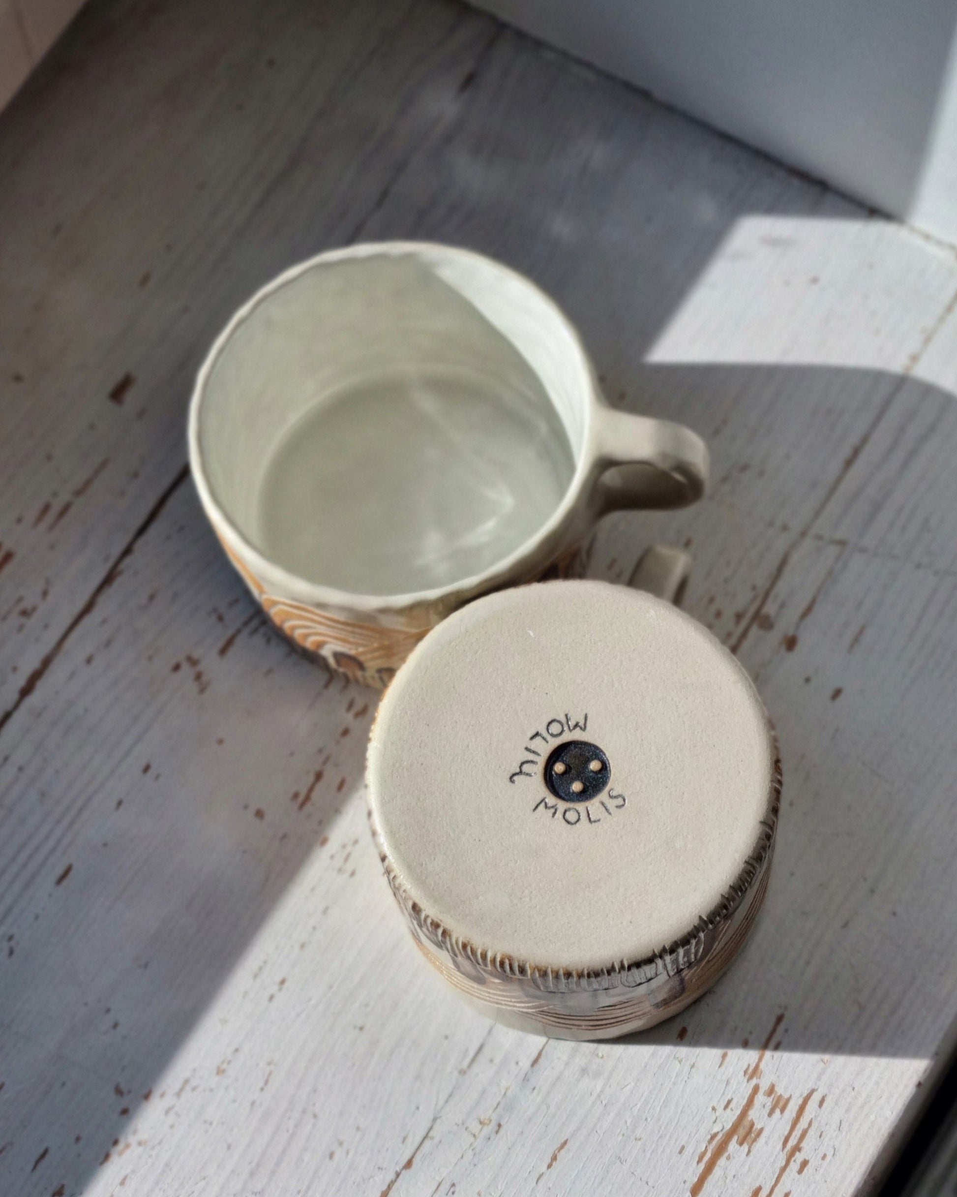 Žemas puodelis baltu vidumi ir raižytu dekoru išorėje.