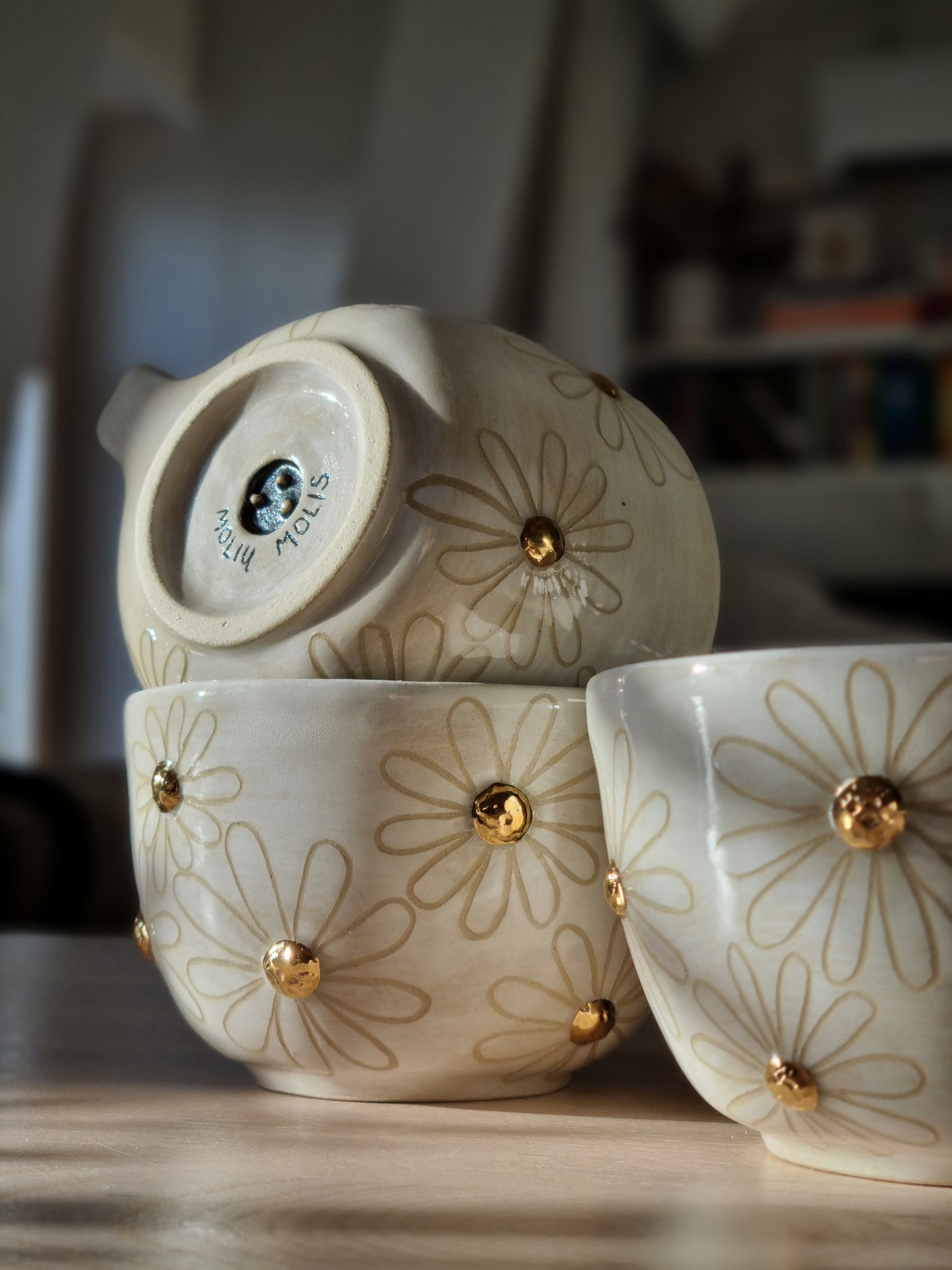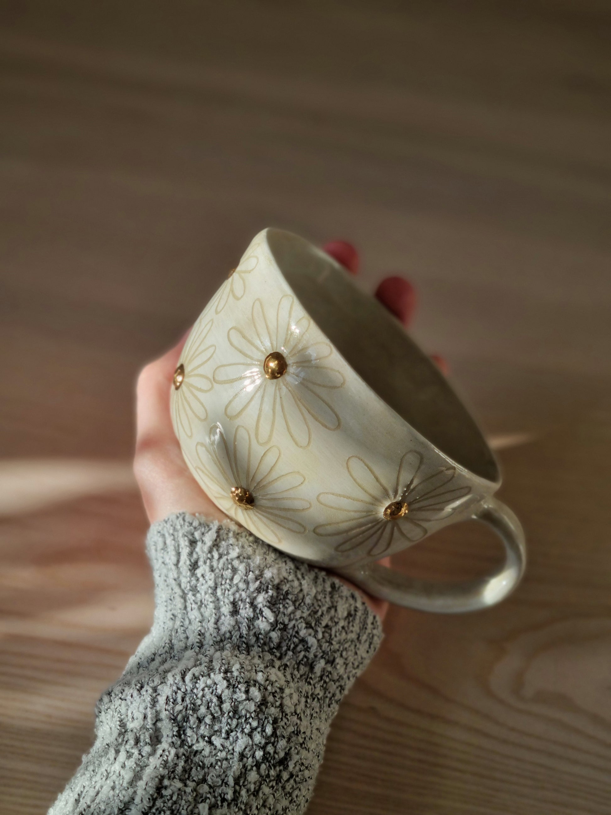 Gėlėtas puodelis puoštas tikru auksu. Gali tapti elegantiška dovana.