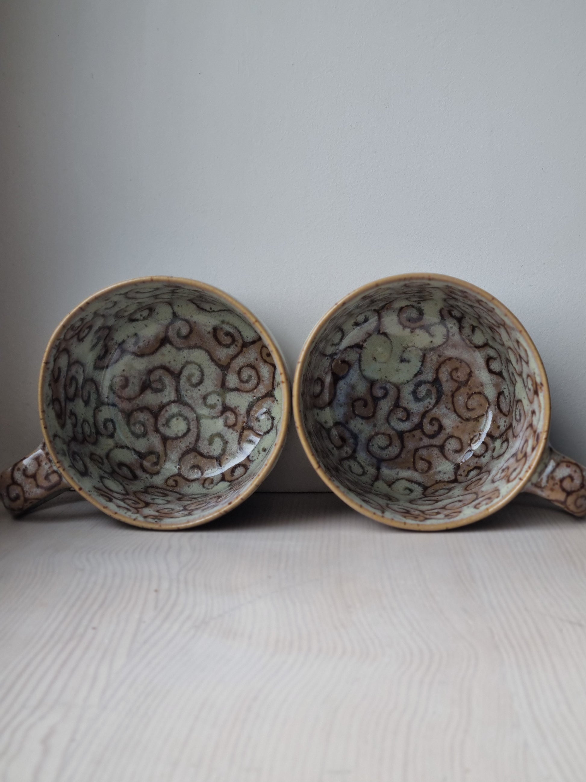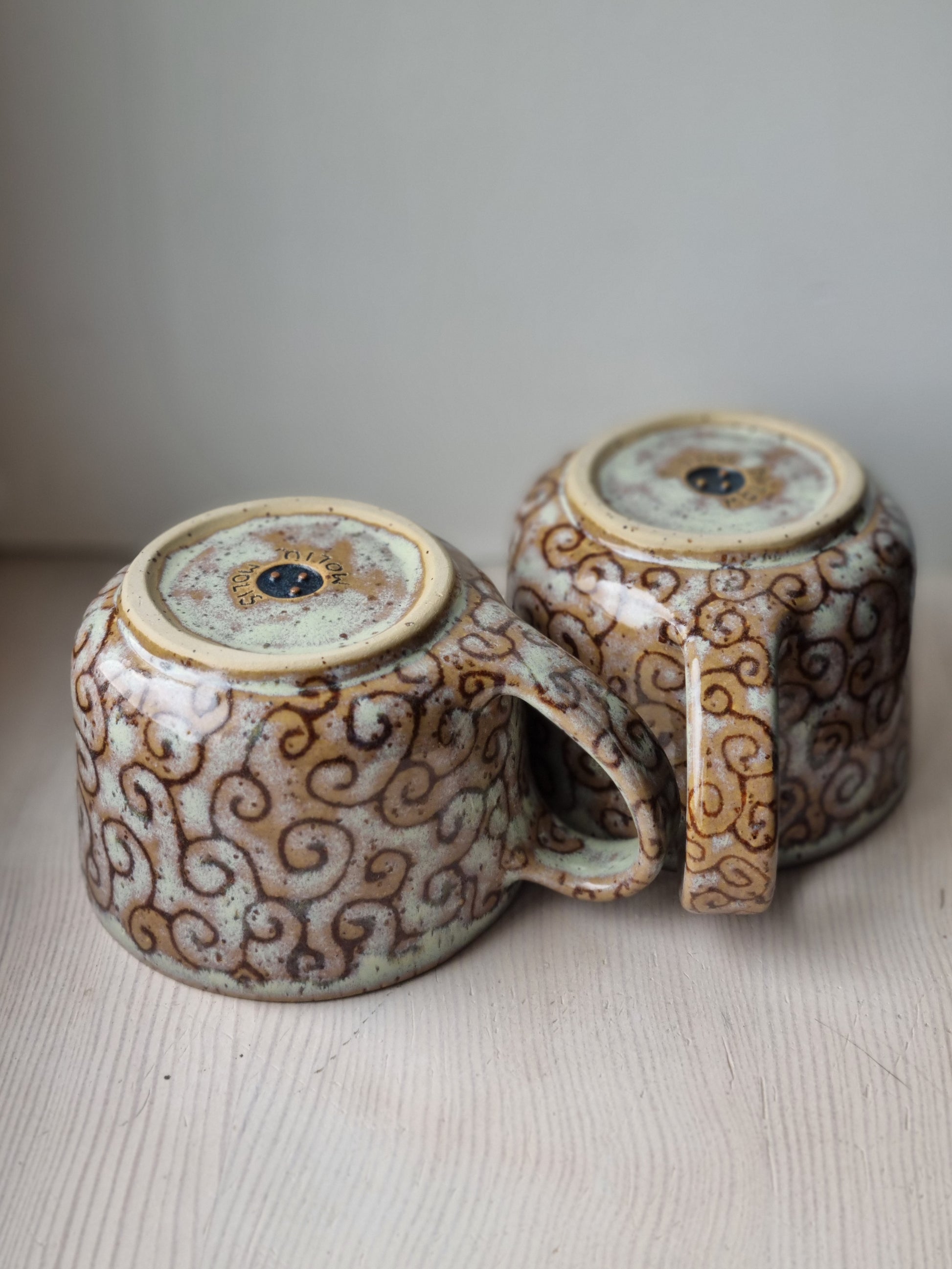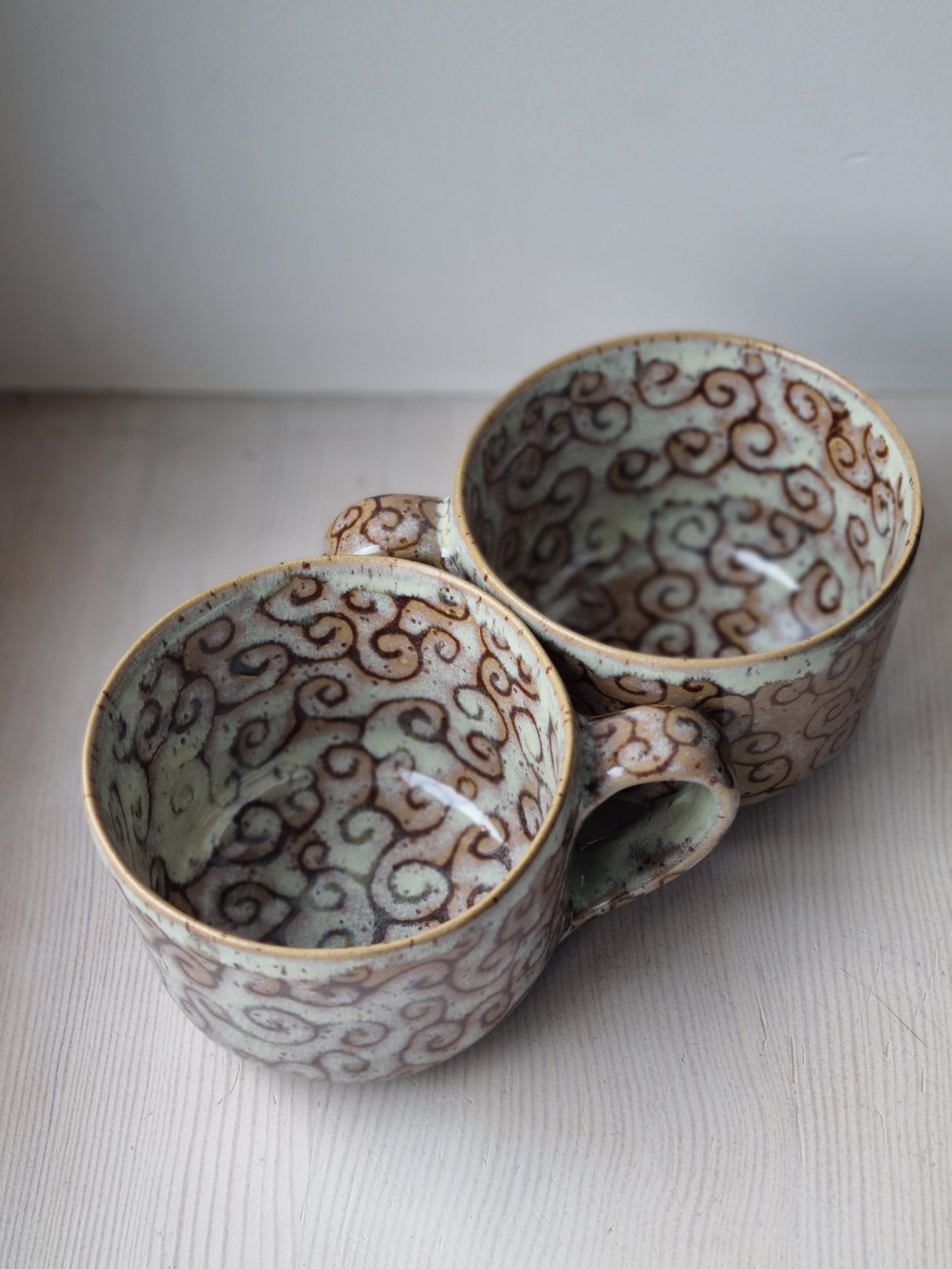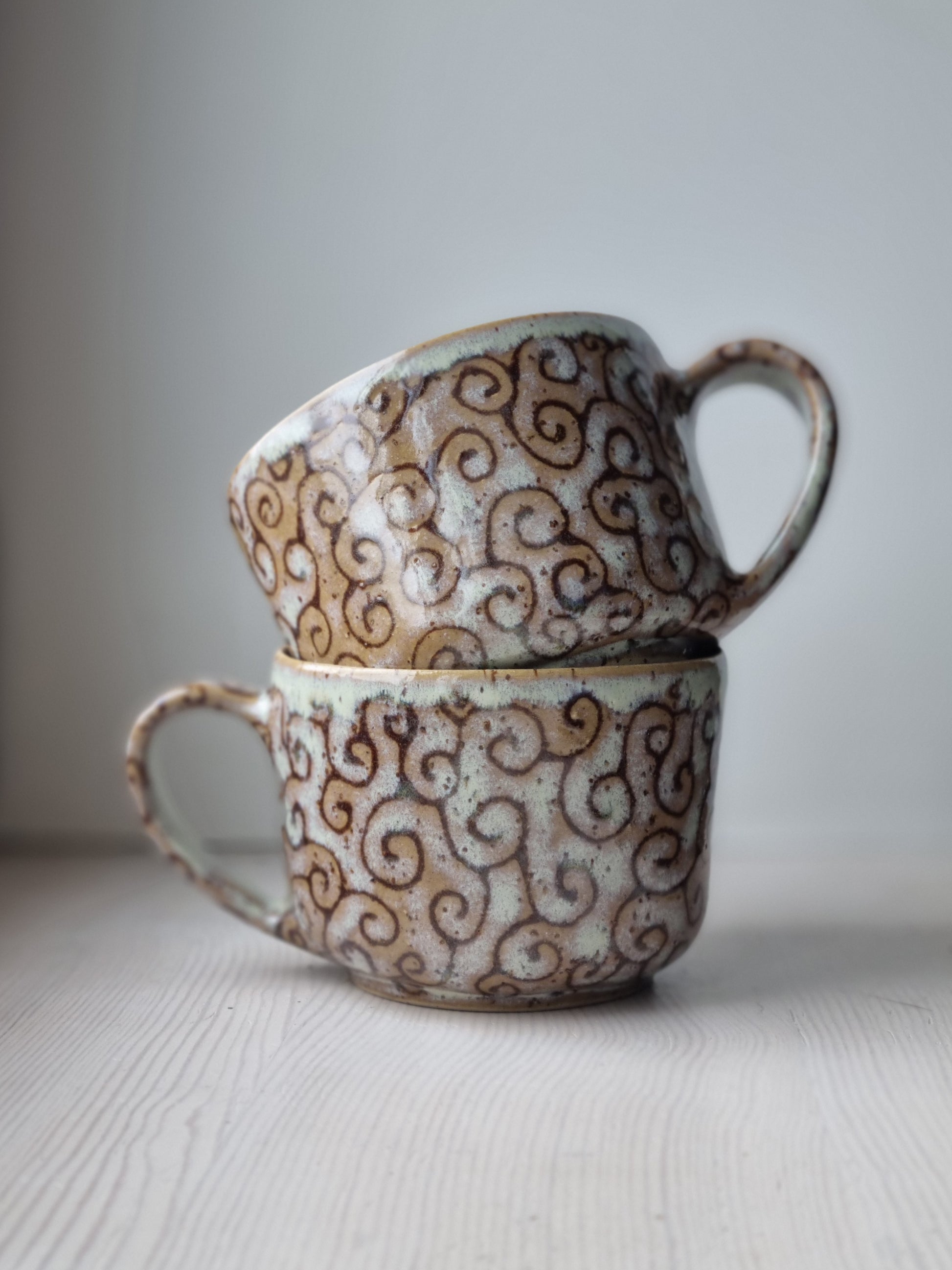 Lyg speigo raštų išmargintas puodelis iš rudo taškuoto molio.