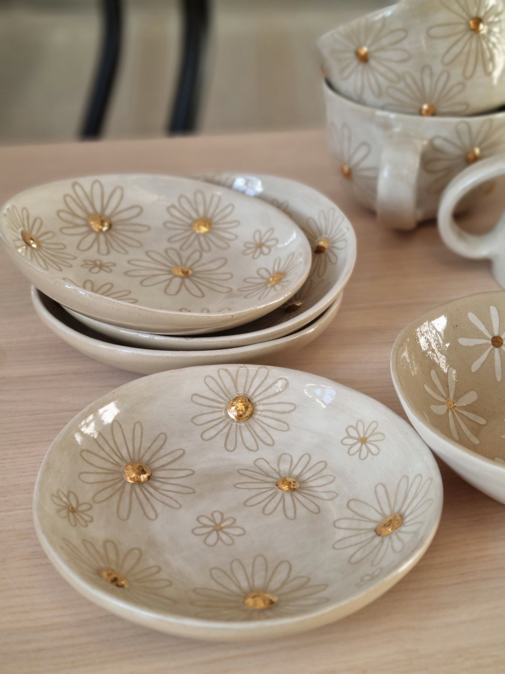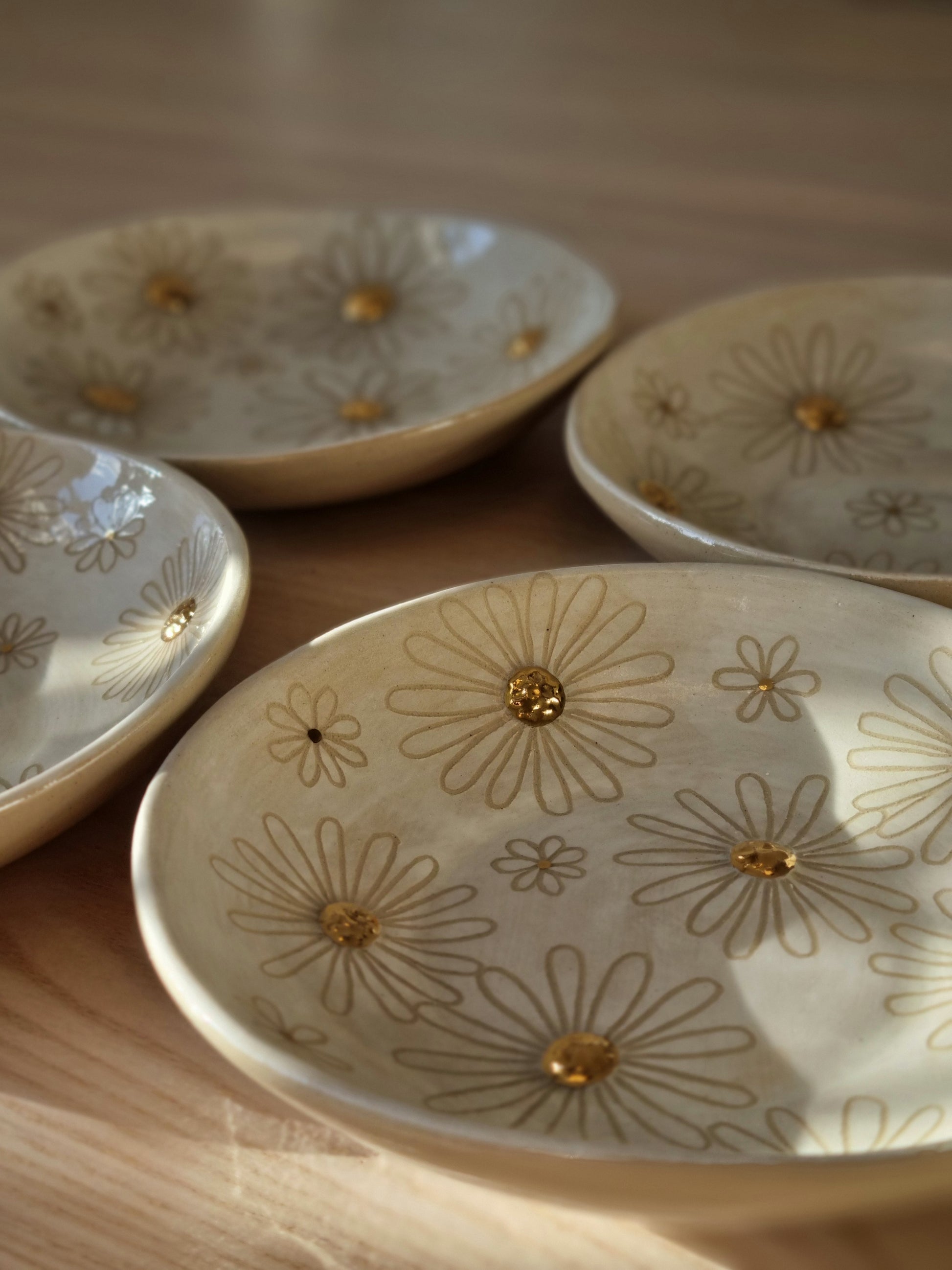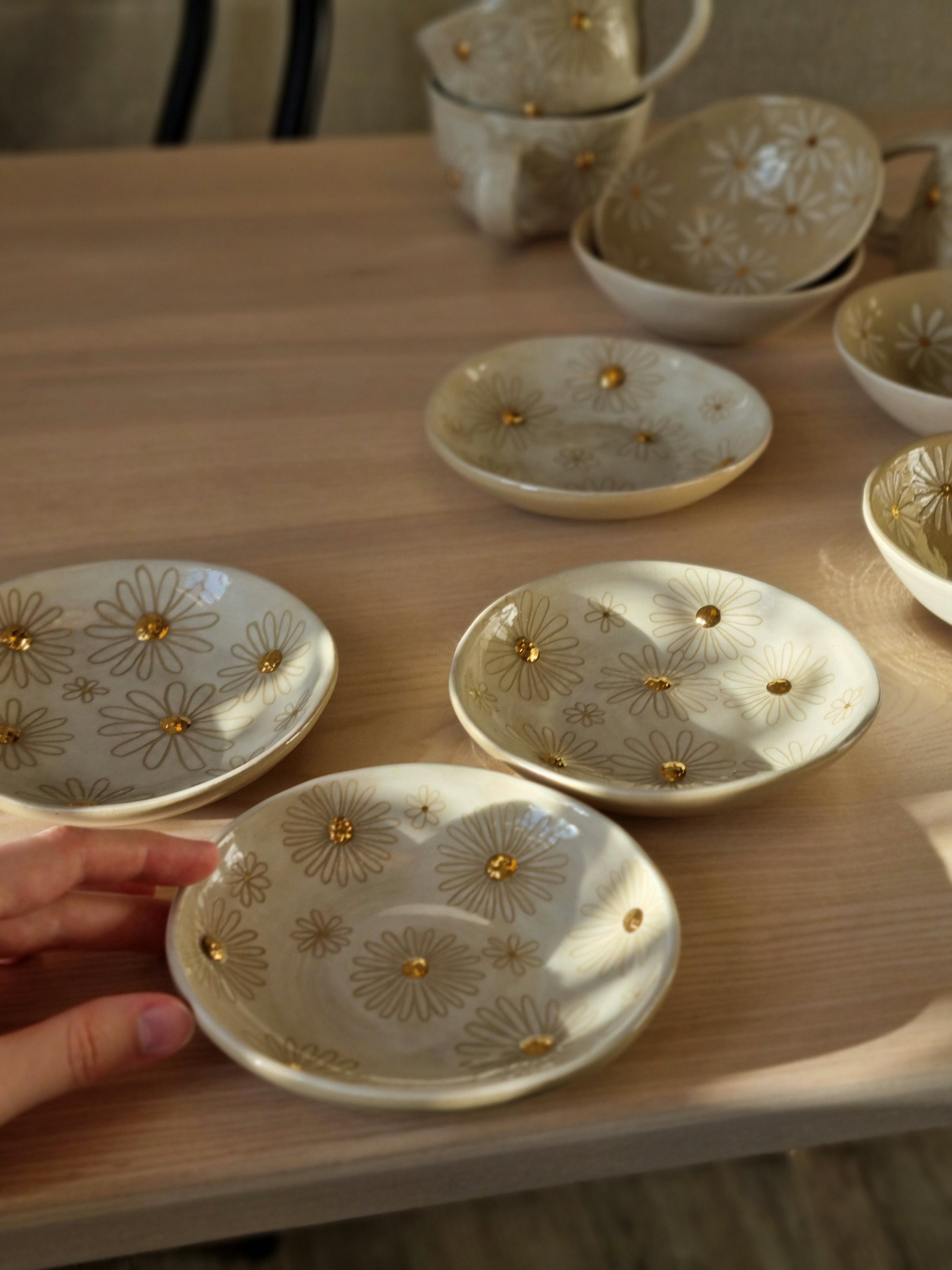 Gėlėta lėkštelė užkandžiams ar skaniausiam desertui, puošta auksu.